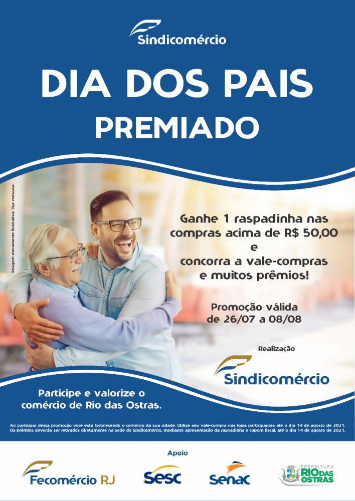 Com o objetivo de incrementar as vendas do comércio local, Rio das Ostras lança campanha “Dia dos Pais Premiado”. Uma realização do Sindicomércio – Sindicato Patronal do Comércio Varejista de Rio das Ostras, com apoio da Fecomércio, Sesc RJ, Senac RJ e Prefeitura.