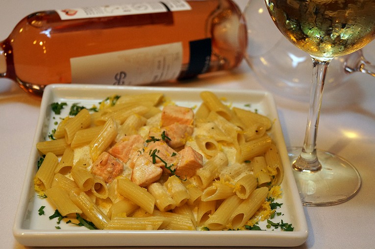 Penne ao molho de salmão, creme de leite, gengibre e limão siciliano.