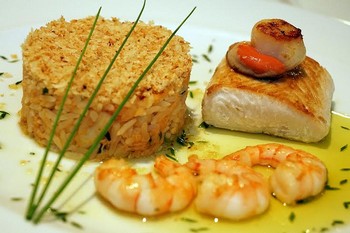 Vieiras, camarões e filé de dourado grelhados. Acompanhados de risotinho de carne de siri, lula e temperos. Finalizado com farofa crocante, azeite de ervas frescas e chuva de cebolinha.