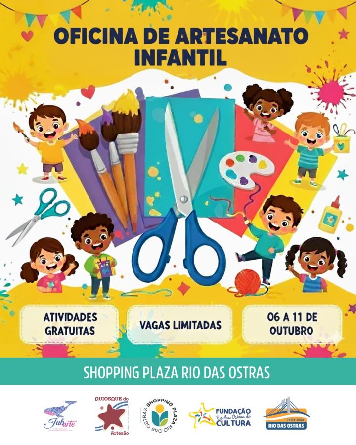 Em celebração ao Dia das Crianças, a semana de oficinas de artesanato gratuitas do Ateliê Plaza / Espaço do Artesão, entre 6 e 11 de outubro, serão exclusivamente voltadas para o público infantil. As aulas acontecem graças a uma parceria entre a Fundação Rio das Ostras de Cultura e o Shopping Plaza Rio das Ostras.