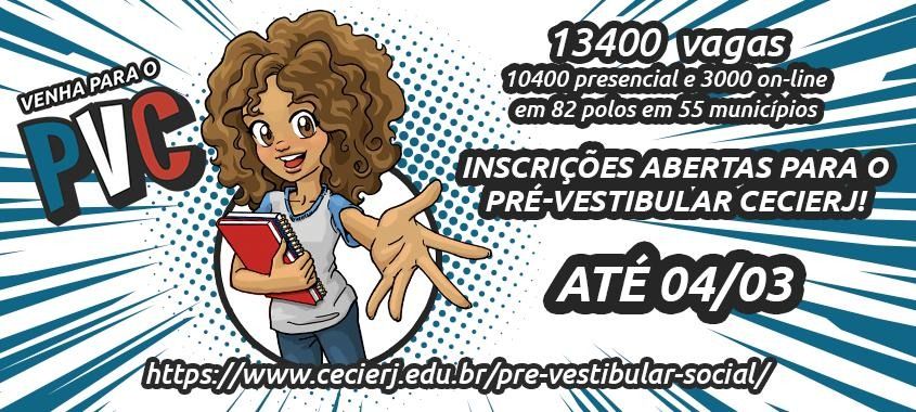 INSCRIÇÕES – As inscrições podem ser realizadas pelo link: www.cecierj.edu.br/pre-vestibular-social/estude-no-pvs/.
